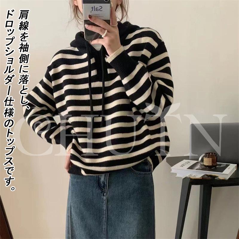 ニット フード ニットパーカー フーディー レディース ボーダー柄セーター パーカー 黒トップス ドルマンレディースパーカー秋冬ニットパーカー 全2色