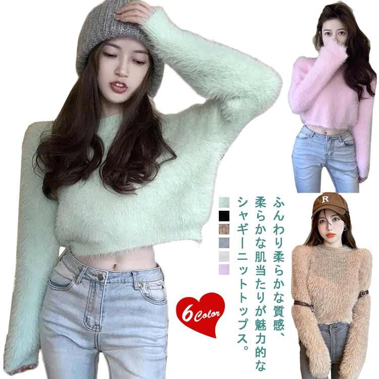 大人の魅力 クロップド丈ニット レディース シャギー ラウンドネック シャギーニット ミディアム丈 長袖 起毛 プルオーバー ニット セーター ニットトップス ニ