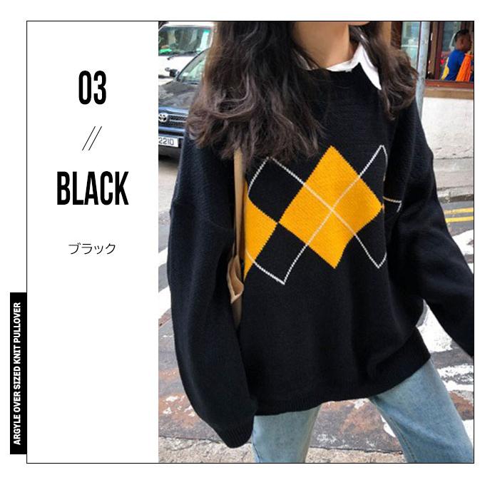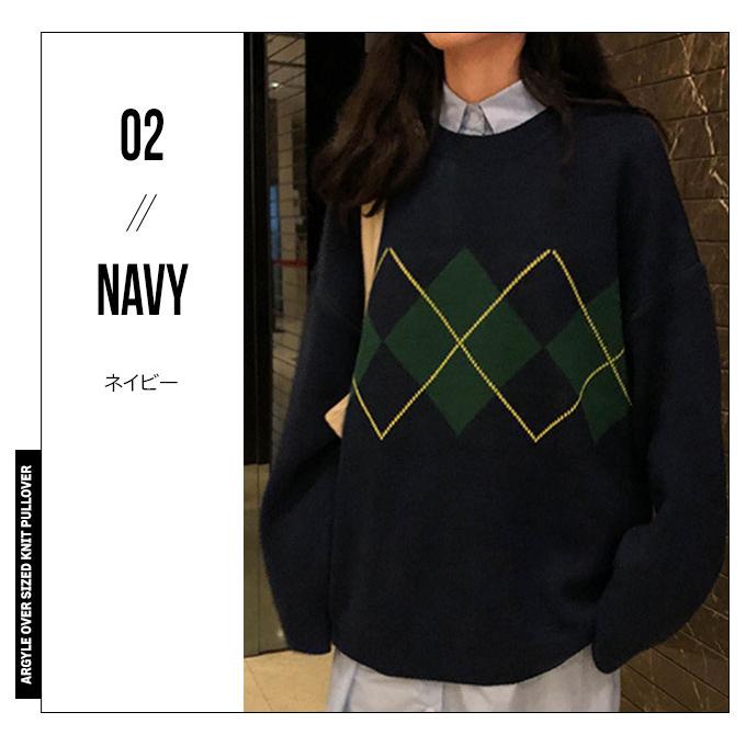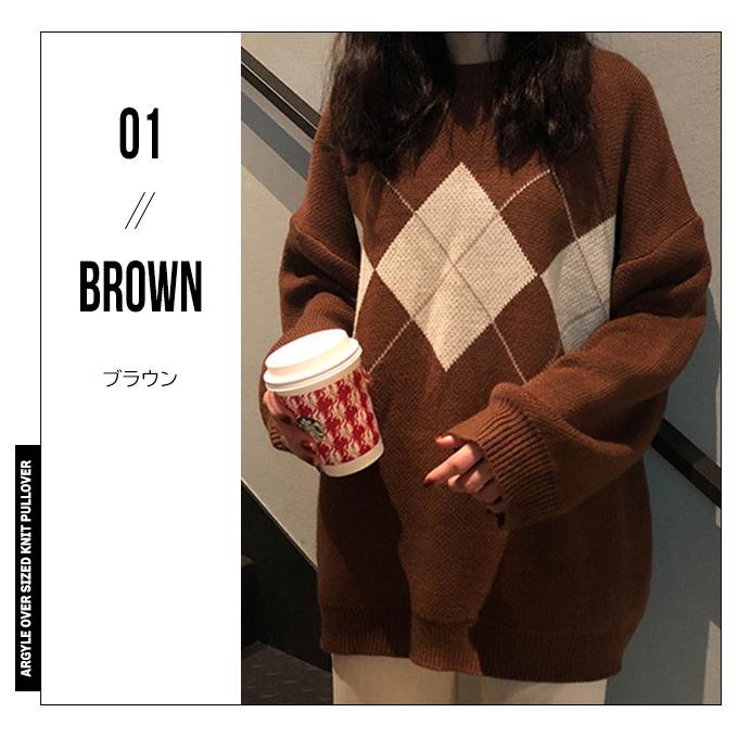 アーガイル ニット レディース 秋冬 オーバーサイズ 長袖 おしゃれ ゆったり かわいい ブラウン ネイビー ブラック