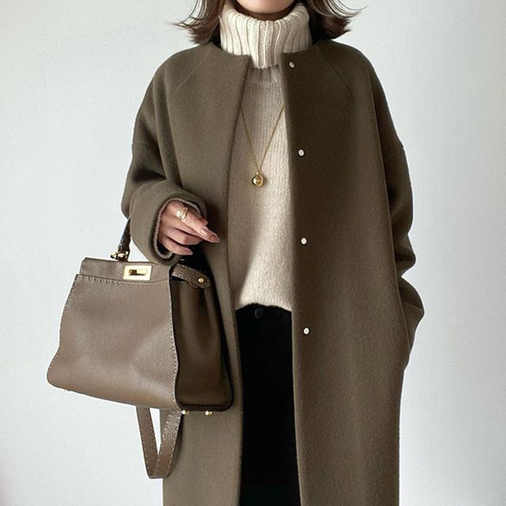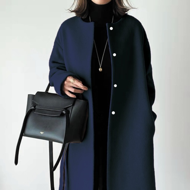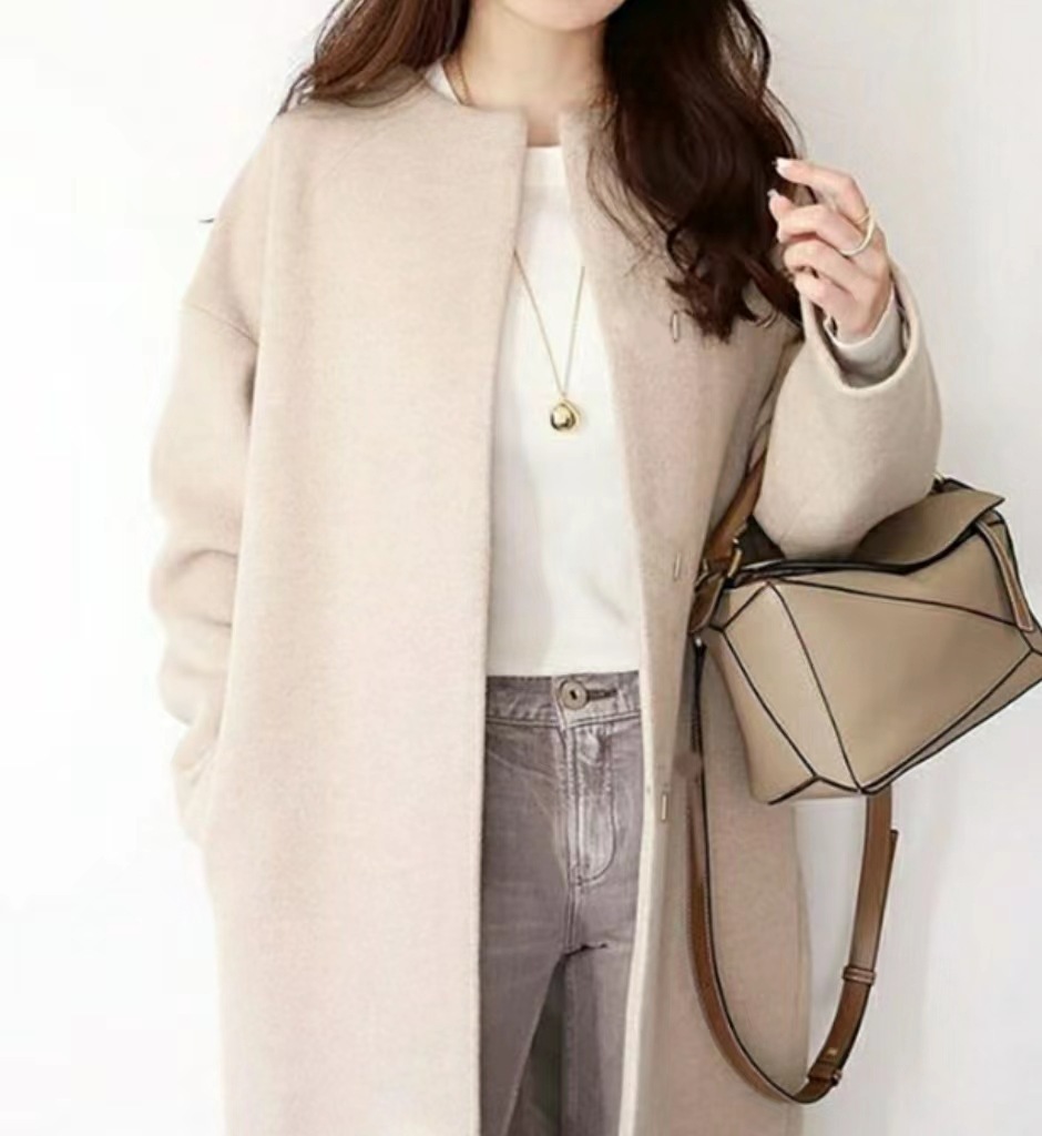 vog-5色日韓優雅コート2024年秋冬通勤ストレート型綿丸襟ベルトなし韓国版コート