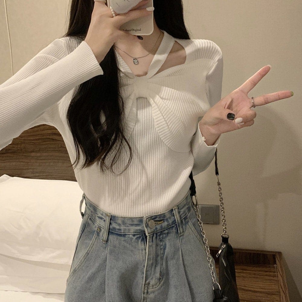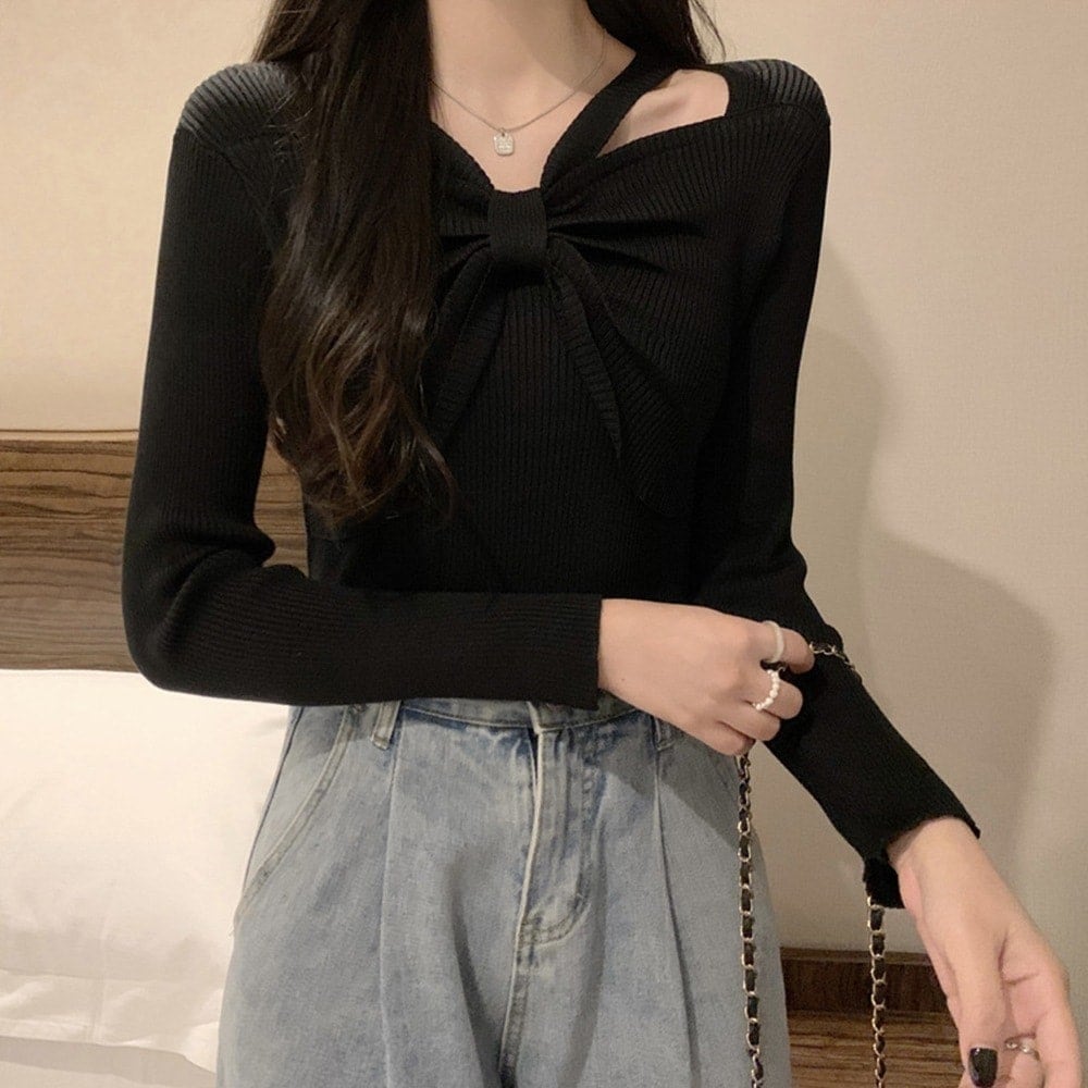 ベーシックニット フロントリボンリブニットトップス大人秋服 韩国 ファッション
