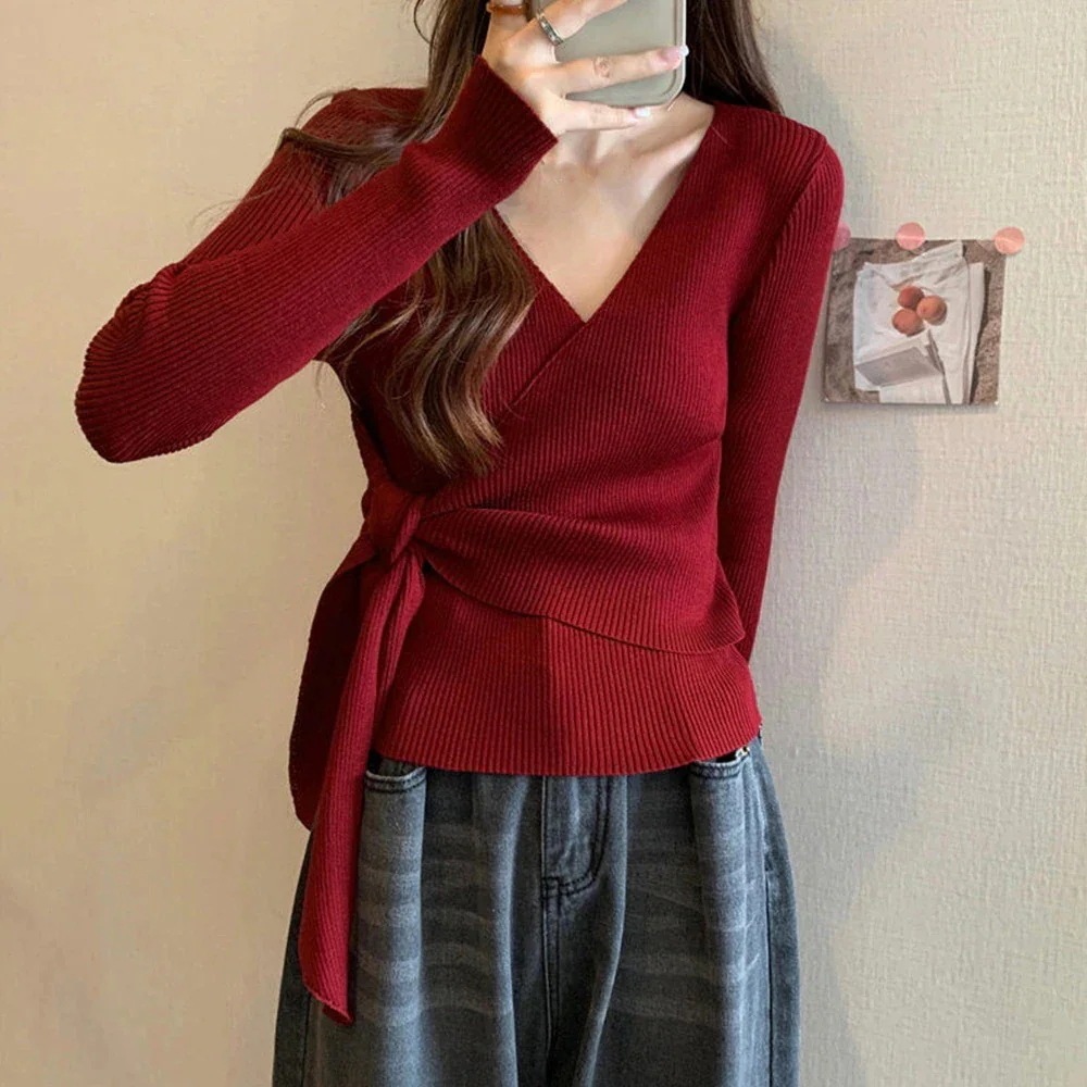 カシュクールリブニットトップス 大人秋服 韩国 ファッション