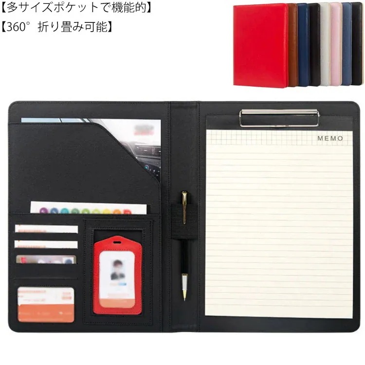 バインダー A4 クリップボード レザー 革 感 名刺 カード ペンホルダー 多機能 クリップ ファイル 二つ折り 多機能 会議 打ち合わせ ミーティング 勉強 講義 ポケット付き 名刺入れ付き