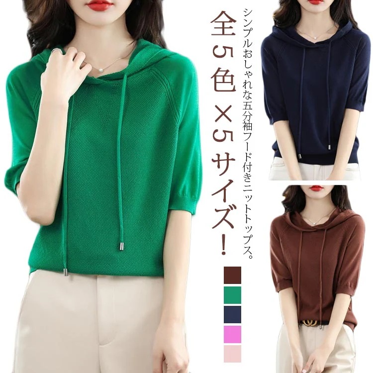トップス 半袖 サマーニット レディース プルオーバー パーカー ニットパーカー 全5色5サイズ!ニット カジュアル フード付き 5分袖 tシャツ シンプル ゆったり おしゃれ