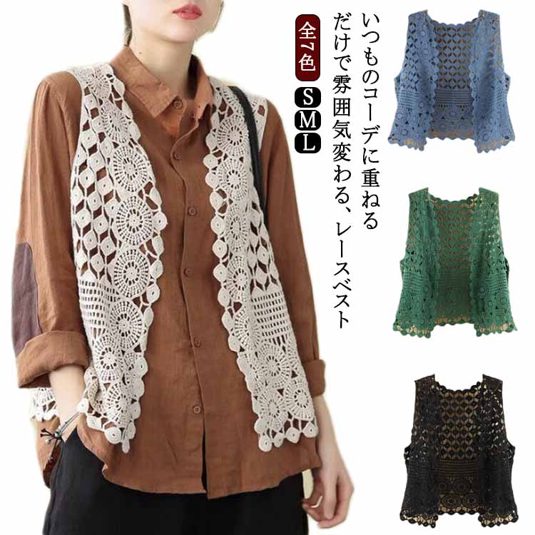 無地 透かし編み ショート丈 レディース ベスト 総レース カジュアル 花柄 コットン トップス レースベスト 袖なし ノースリーブ 羽織 メッシュ編み ボタン無し ボタンなし 重ね着 ナチュラル お