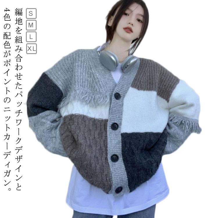 急速出荷 ニット カーディガン 配色 パッチワーク レディース 秋 冬 ニットカーディガン ケーブル編み 厚手 レトロ調 オーバーサイズ ゆったり Vネック ニット カーデ 羽織り アウター 秋服 秋
