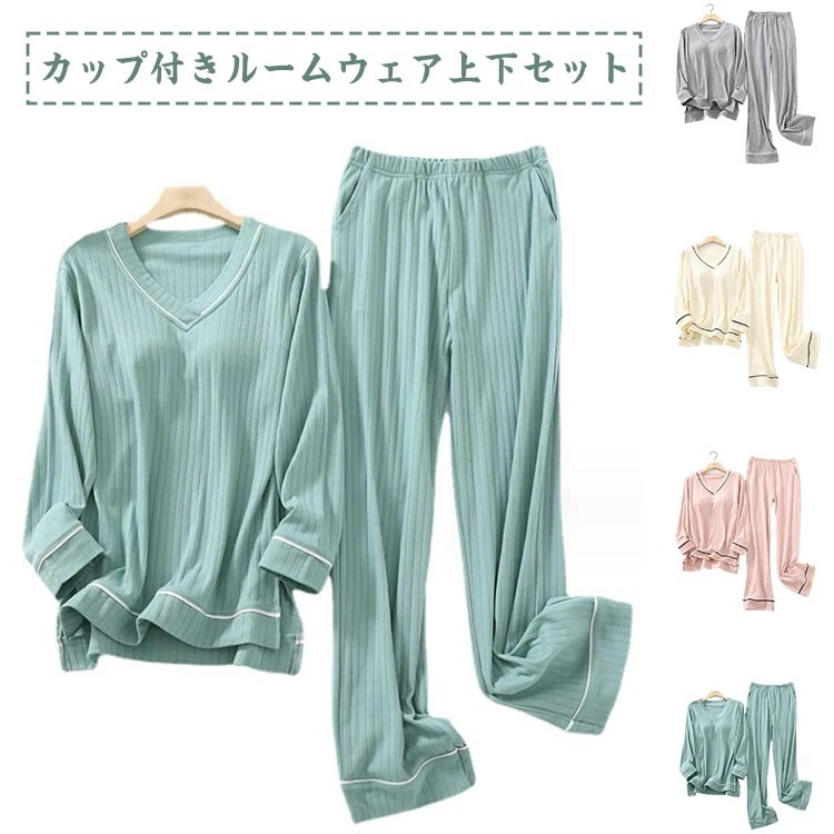 急速出荷 ルームウェア レディース カップ付き 部屋着 パジャマ 寝具 寝巻 コットン 綿 リブ 長袖 トップス vネック ロングパンツ ゆったり 秋冬 春 服 上下 セットアップ ナイトウェア 送料
