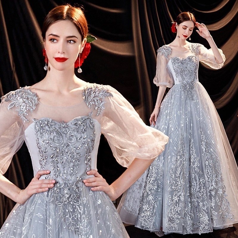 スモークグレーイブニングドレス長袖2025ピアノ演奏ホストパフォーマンスウェディングドレス夏