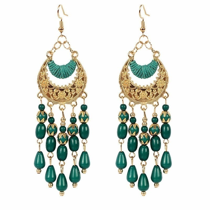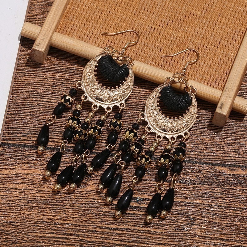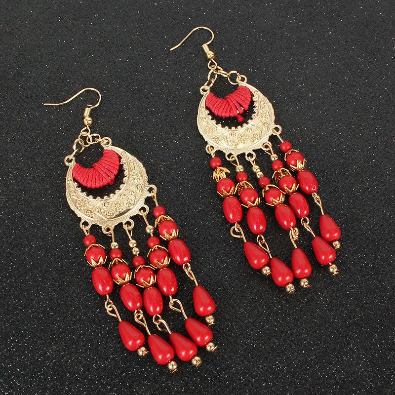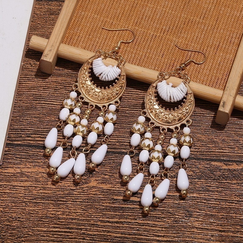 シルバーボヘミアンライスビーズタッセルイヤリング誇張されたロングイヤーフックファッションエスニックスタイル三日月イヤリング