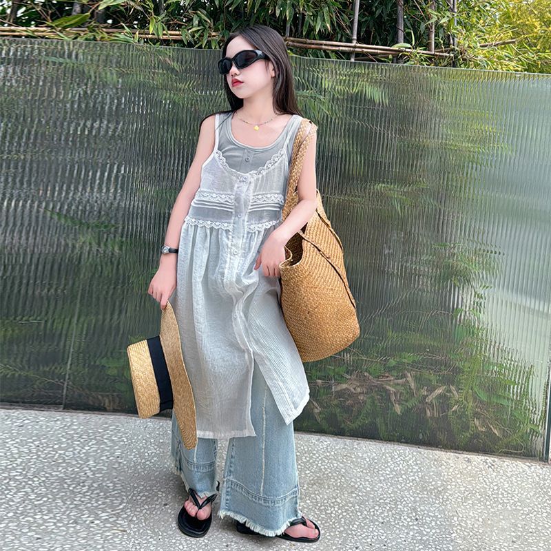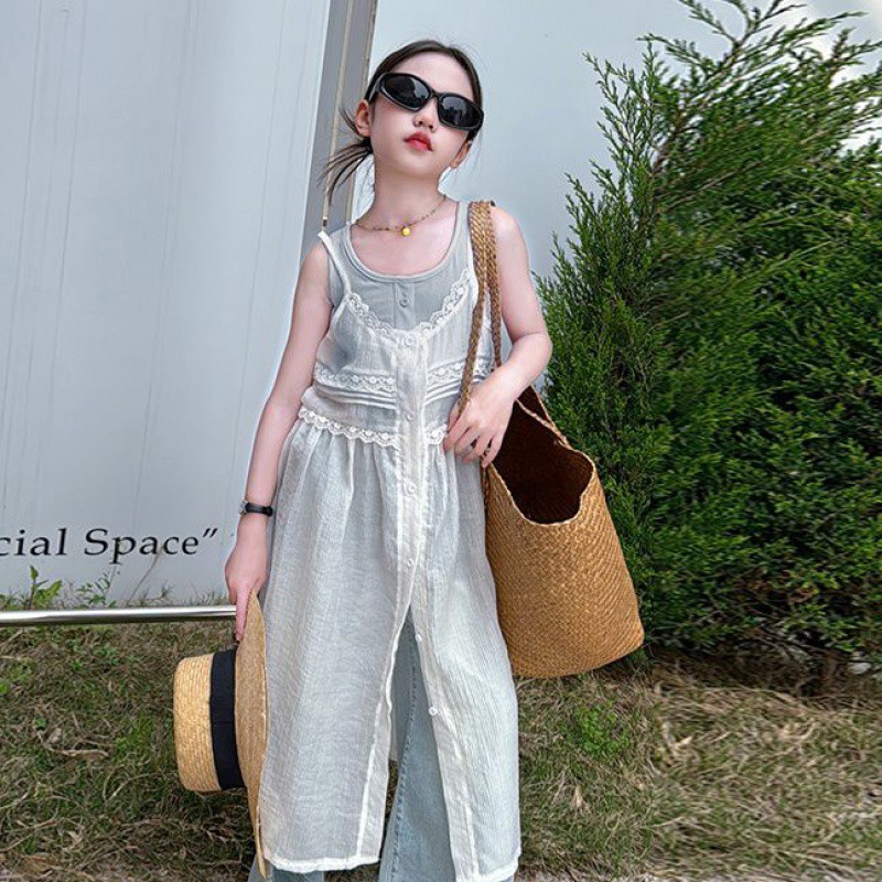 女の子サマースーツ2025韓国風子供おしゃれ大きい子供服サマーベストガーゼスカート3点セット