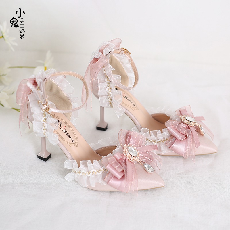 優しい蝶が降るピンクの花の結婚式ロリータ成人式ハイヒールポインテッドトゥロリータサンダル単品