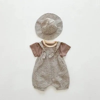 2024ベビー服男の子と女の子のロンパース韓国チェックの赤ちゃんの半袖Tシャツ+オーバーオール+帽子