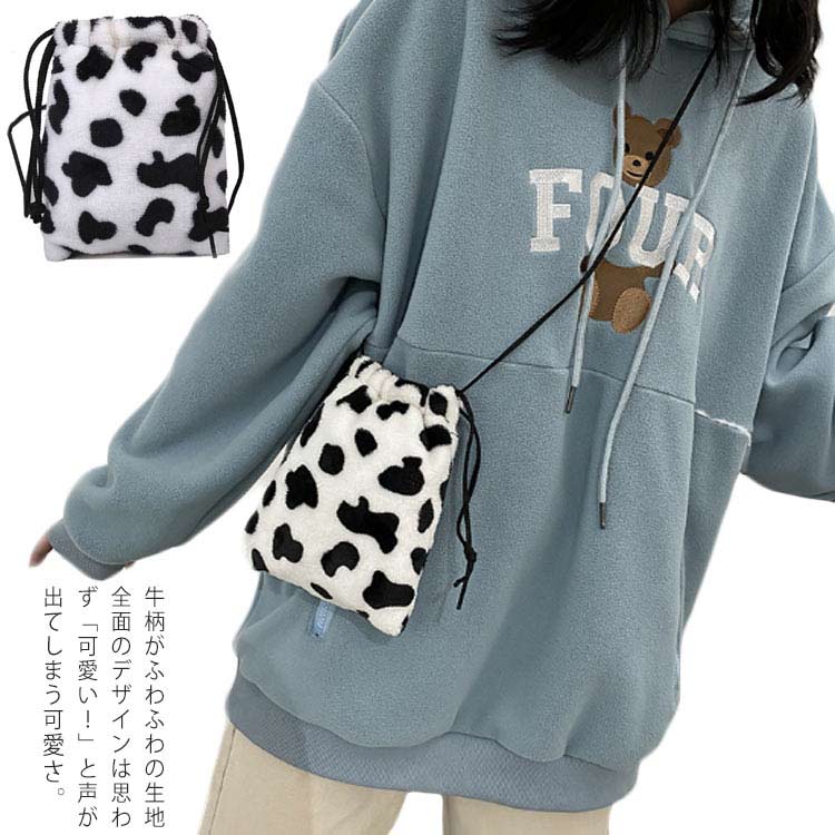 巾着バッグ ショルダー レディース 巾着袋 牛柄 ポーチ 大人 斜めがけ ショルダーバッグ 2way カバン ハンドバッグ 肩掛け 秋冬 もふもふ ふわふわ 小さめ 軽量 マチ広 ミニバッグ コンパク