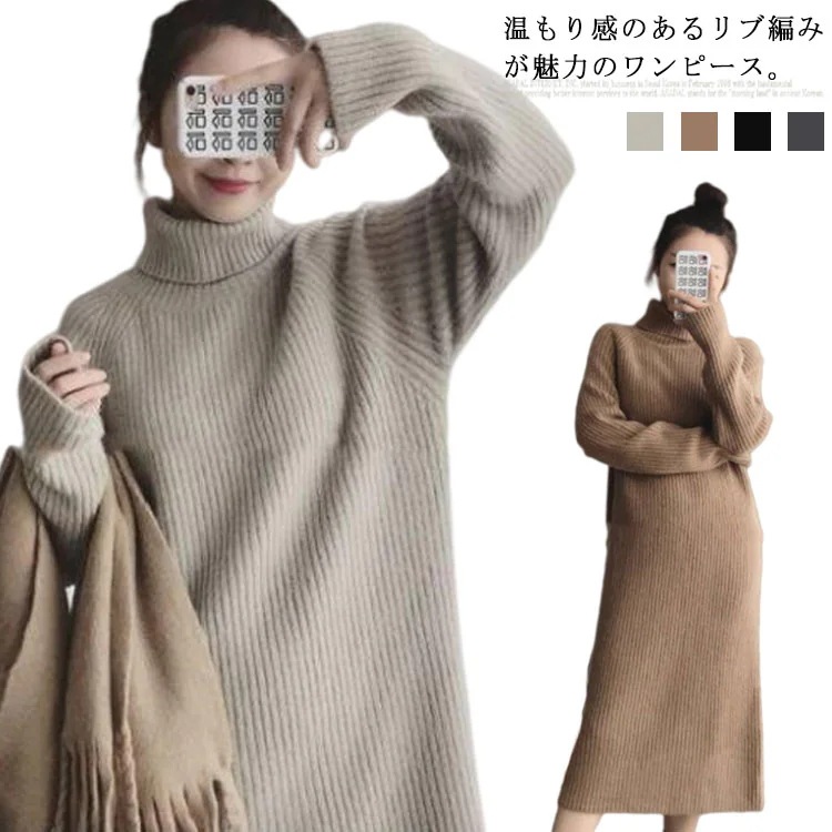 ニットワンピース 長袖 レディース リブニット ロングワンピース ミモレ丈 タートルネック ハイネック ニット ワンピ ゆったり 大きいサイズ 秋 冬 無地 暖かい セーター ドロップショルダー ルー