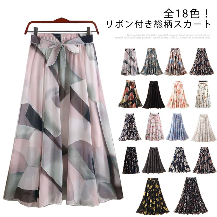 スカート レディース フレアカート シフォン素材 ミモレ丈 スカート 春夏 ロングスカート 花柄 ドット柄 総柄 スカート 涼しい ボトムス Aライン 体型カバー リボン付き ウエストゴム 裏地付き