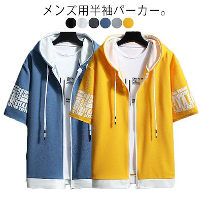 半袖パーカー メンズ ジップアップ パーカー フード付き 半袖 ジップパーカー トップス 羽織り 薄手 夏 アウター ライトアウター スウェット おしゃれ オーバーサイズ ゆったり 大きいサイズ 英字