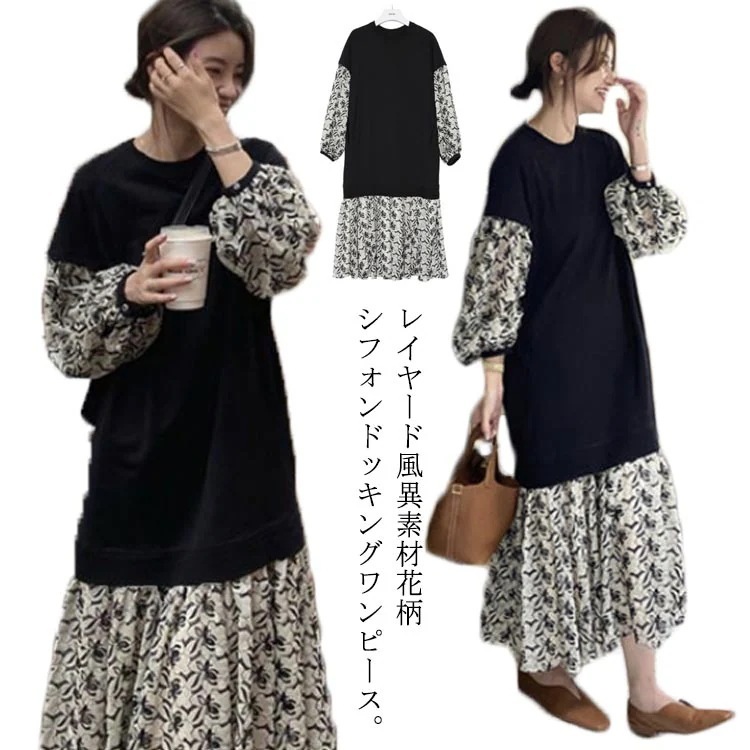 ドッキングワンピース レディース 長袖 レイヤード風 シフォンワンピース マキシ丈 春 夏 秋 花柄 異素材 ロングワンピース おしゃれ 体型カバー きれいめ ドレス カジュアル