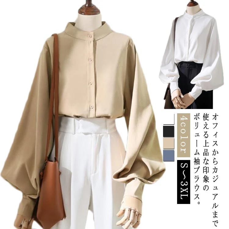 ボリュームスリーブシャツ シャツブラウス レディース オフィス カジュアル トレンド 長袖 トップス 20代 30代 40代 50代 大きいサイズ S M L XL 2XL 3XL スタンド