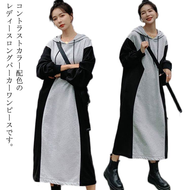 パーカー ワンピース ロング レディース スウェット 長袖 プルオーバー 切り替え ゆったり マタニティ 大きいサイズ おしゃれ 秋 冬 春 大きいサイズ 体型カバー 着瘦せ カジュアル 韓国ファッシ