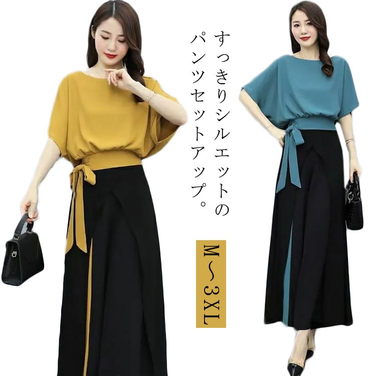 パンツスーツ セットアップ レディース シフォン パンツドレス 2点セット ワイドパンツ パーティードレス ロング パンツ ブラウス シャツ フォーマル 春 夏 秋 半袖 大きいサイズ スー
