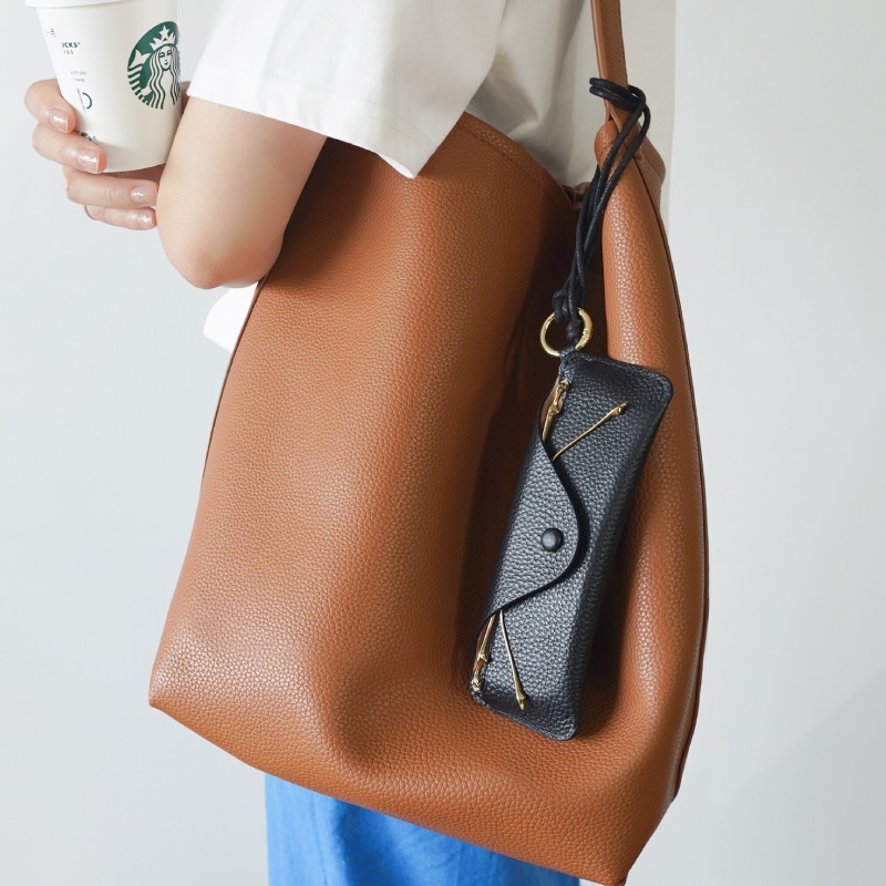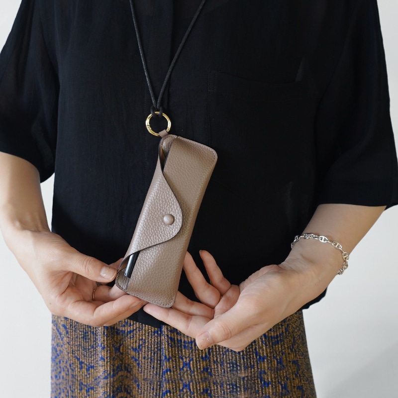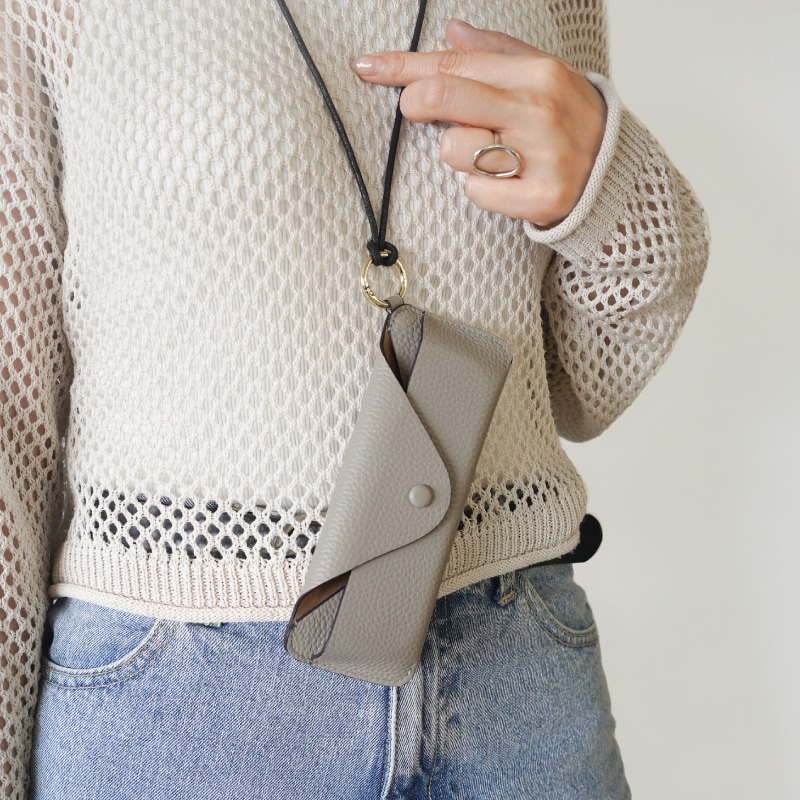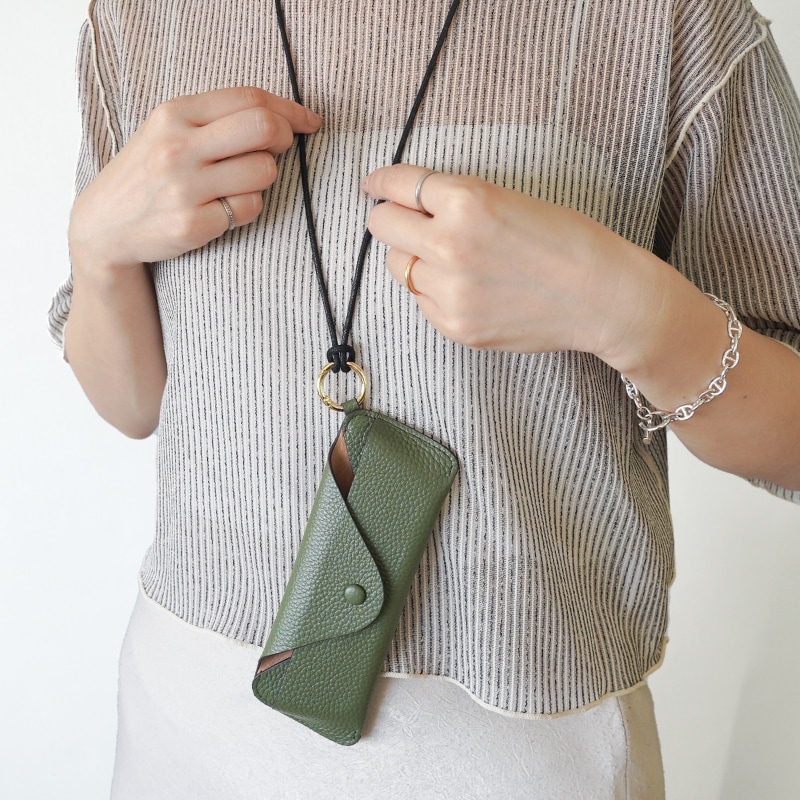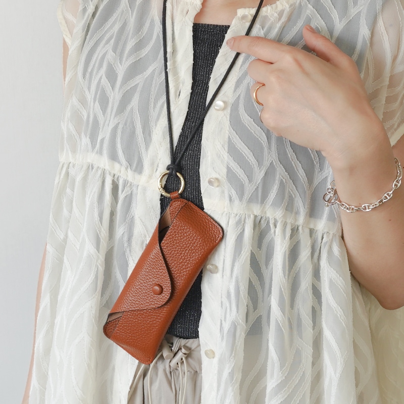 スリムでストラップも付いてて首からかけてもそこまで違和感無く便利です。ただ薄いからか厚めのサングラスなどは入れにくく、ものによってはボタンが閉まらないのが残念でした。夏のサングラス用で使いたいのもあり、革なので伸びると思って少し伸ばしてみます。