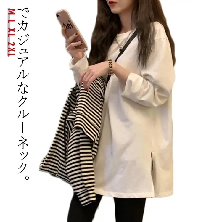 長袖 Tシャツ レディース サイドスリット クルーネック ラウンドヘム ドロップショルダー 春 秋 冬 大きいサイズ ロンt ロンティー ゆったり トップス 無地 重ね着 カットソー インナー 白 送