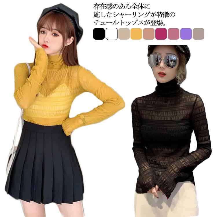 トップス チュールトップス レディース シャーリング タートルネック ハイネック シアー 透け感 インナー 長袖 薄手 無地 カジュアル 大人 フェミニン 上品 可愛い トレンド ストレッチ デート