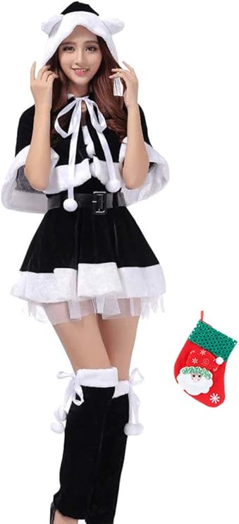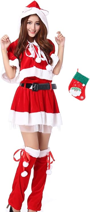 クリスマス セクシー コスプレ サンタクロース 衣装6点セット(ネコ耳フーディーショールトップススカートレッグカバーベルトクリスマスバッグ) コスチューム レディース フリーサイズ 靴下おまけ
