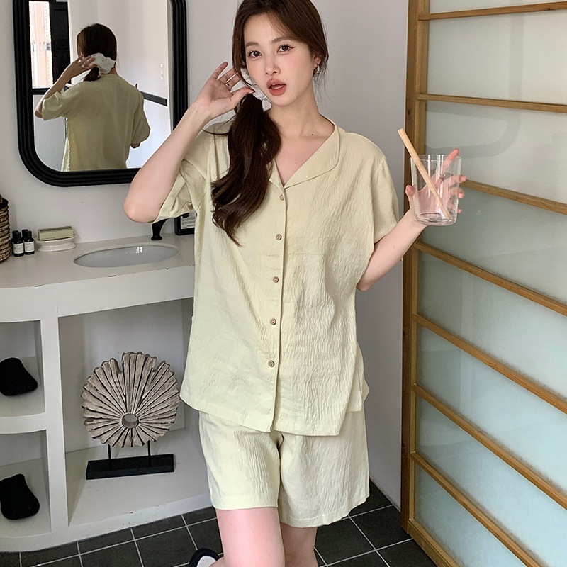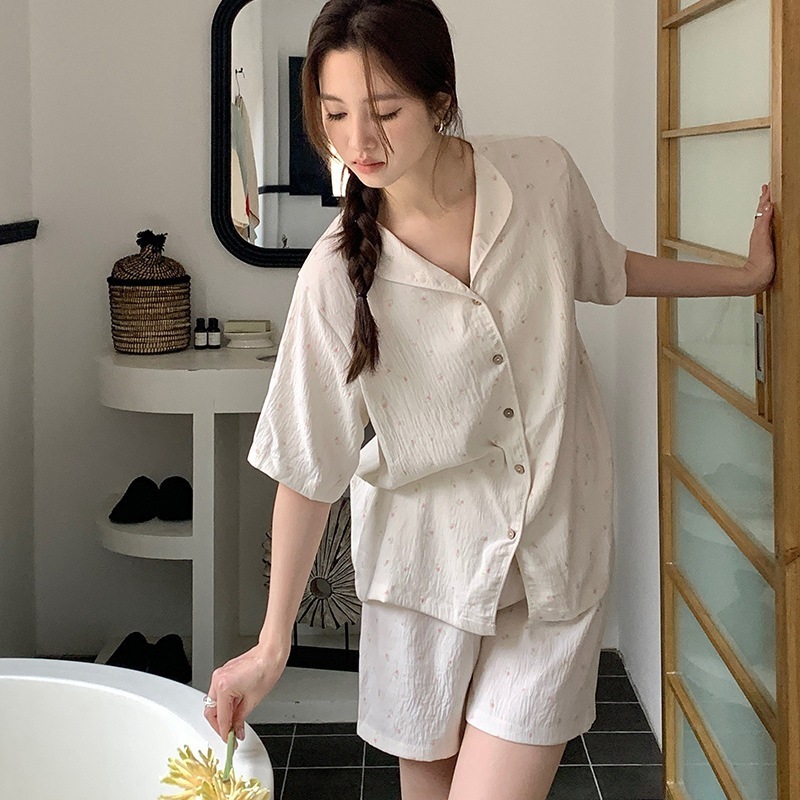 パジャマ パジャマ 夏 前開きパジャマ ナイトウェア 春と夏のホームウェアの女性の新しい緩い半袖カーディガンのトップスセットプリントショーツ