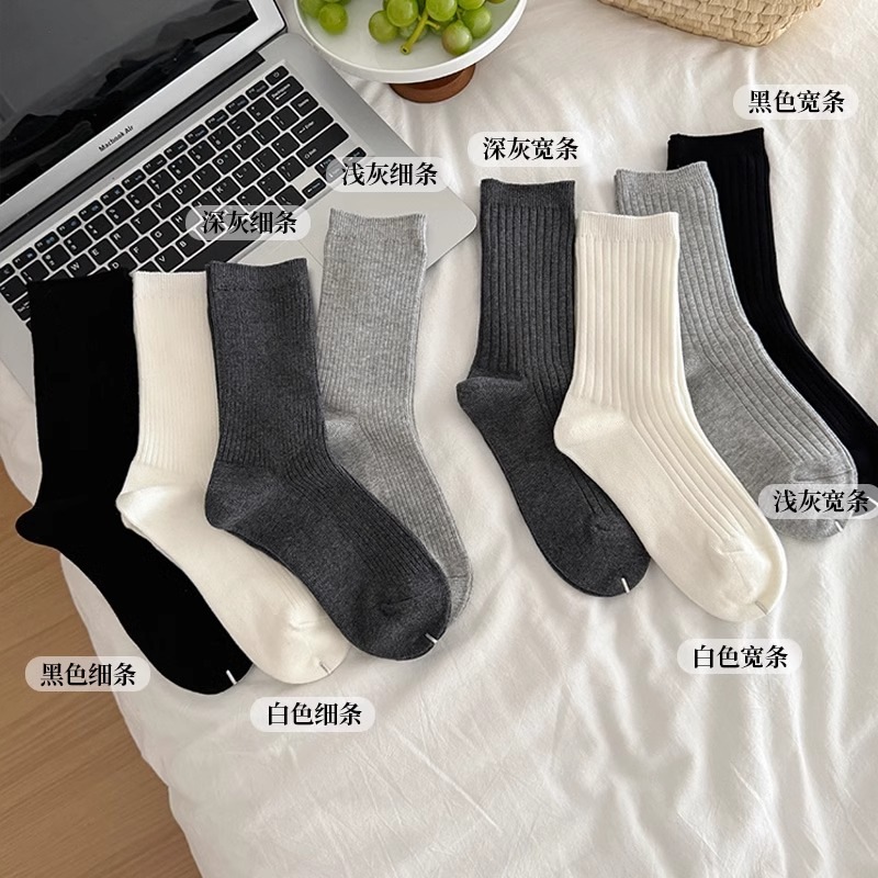 グレーソックスレディースミッドカーフソックス春秋純綿韓国風ロングホワイト夏薄手パイルソックスと小さな革靴