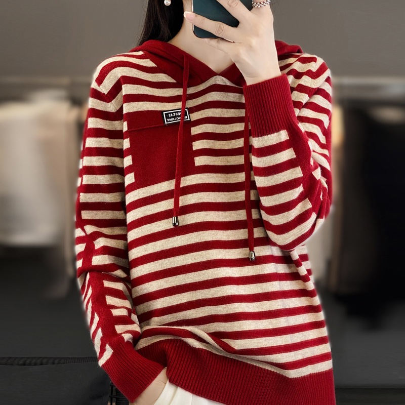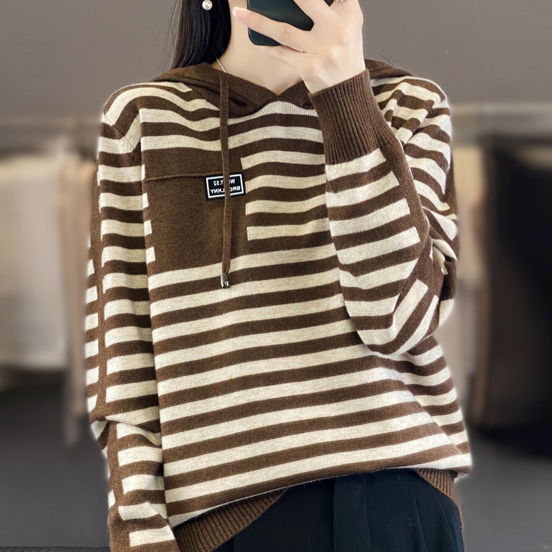2023秋の新型韓国版ファッション洋気フード付きセーター女性ストライプ色合わせカジュアルフード付きニット上着