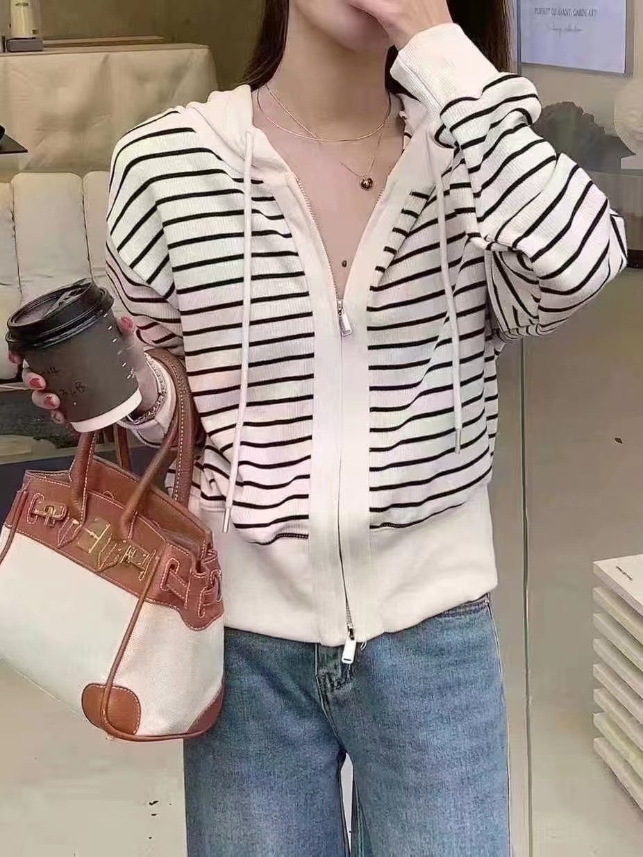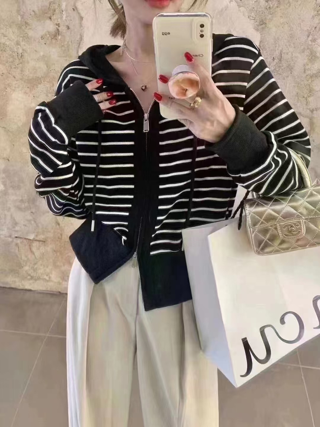 2024春と秋にはカラーストライプのニットフードの女性用カーディガンのダブルジッパーセーターのコートの女性用ファッション