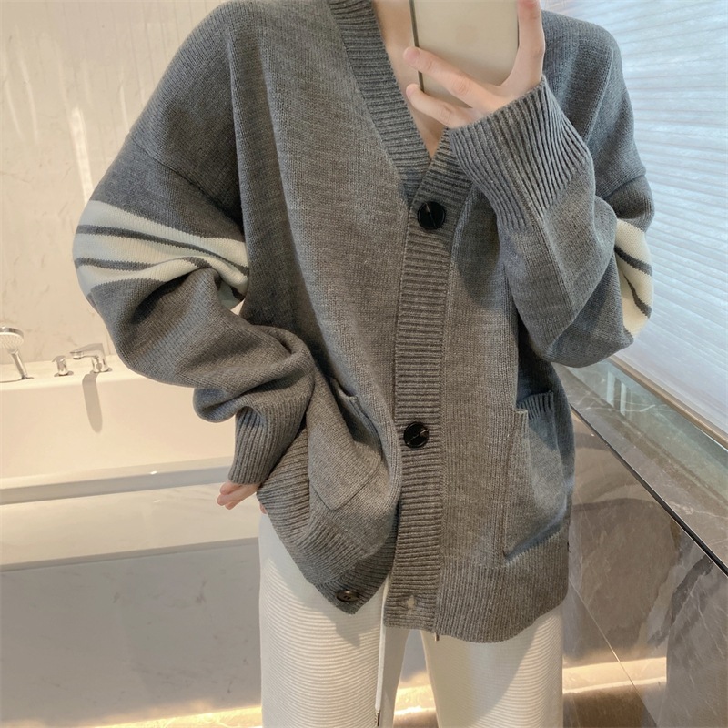2023秋冬新作ストライプカーディガン女性コート韓国版ゆるい学院風長袖ニット上着潮