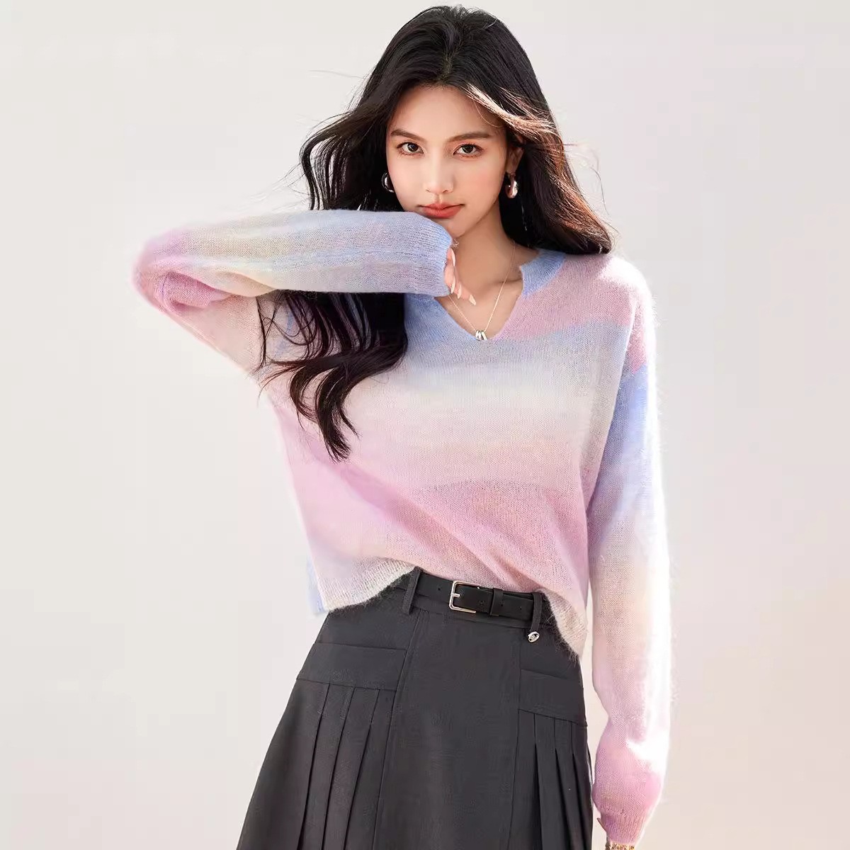 グラデーションの短いセーターのニットは甘い早秋の冬2024の新しいボトムに女性の上着の気質が春になる