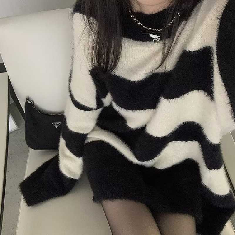 韓国版レトロな縞模様はミンクのベルベットのニットの上着の女性の柔らかいモチとした優しい風がゆったりしているセーターの厚い