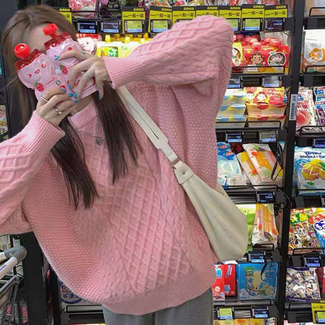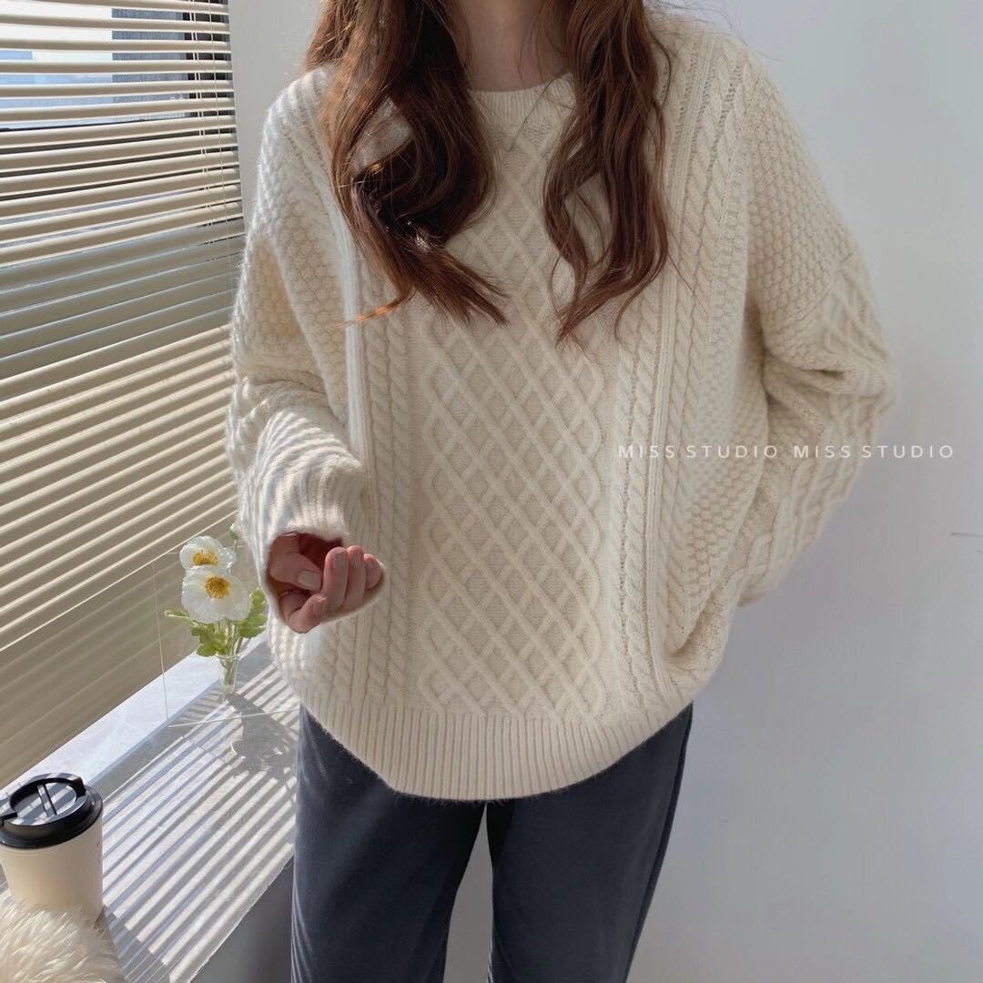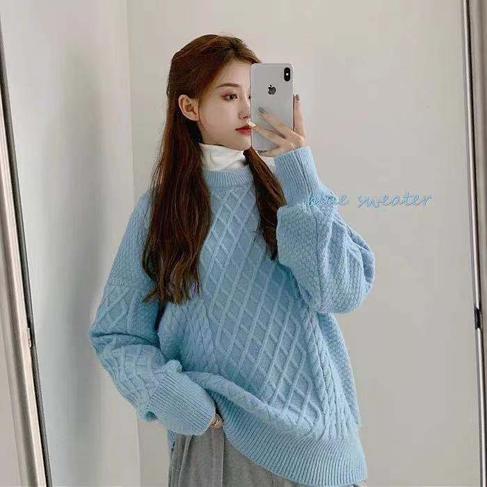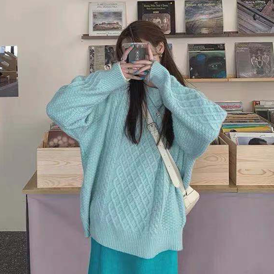 新型青いセーターの女性の大きいサイズはゆったりして秋冬の優しい風の中の長いニット上着を着ている