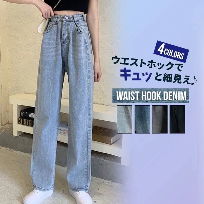 ワイドパンツ デニム レディース 調節 ハイウエスト ストレートデニム トレンド 体型カバー 小尻効果 骨格ウェーブ 骨格ストレート ゆったり ウエストホック 可愛い 韓国ファッション