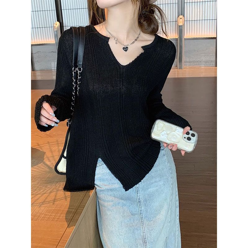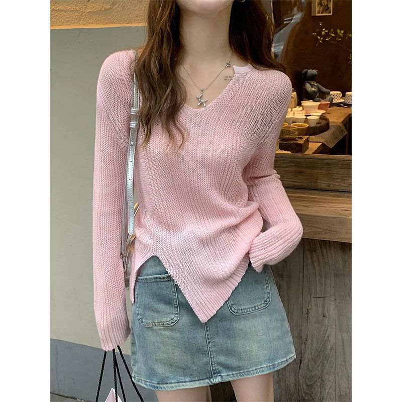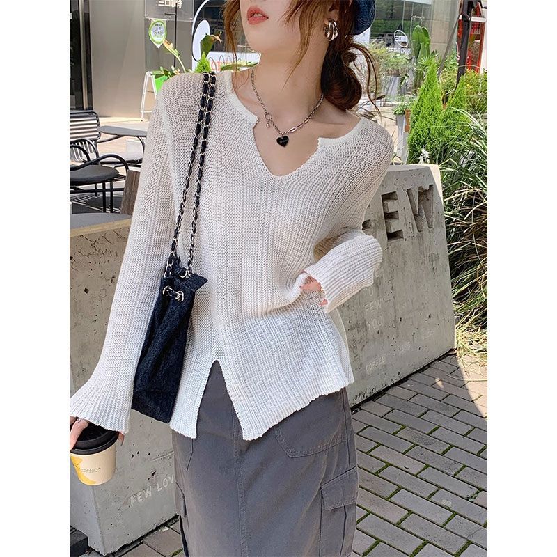 カシミヤタッチ 韓国ファッション Vネック ニットカーディガン ゆったり 着痩せ セーター ニッチデザイン アンダーウェア 可愛い 個性 スリット 長袖 トップス
