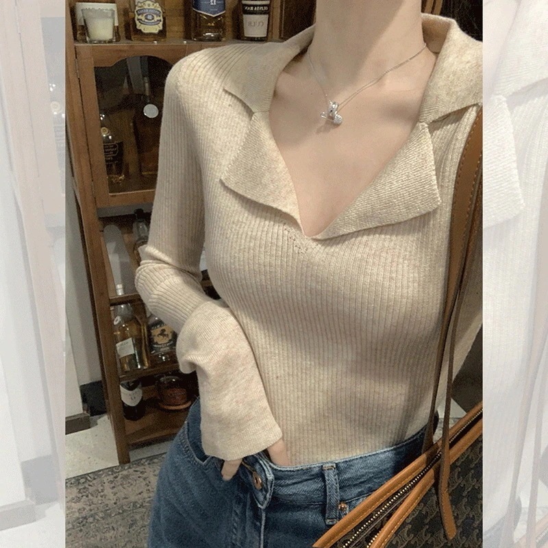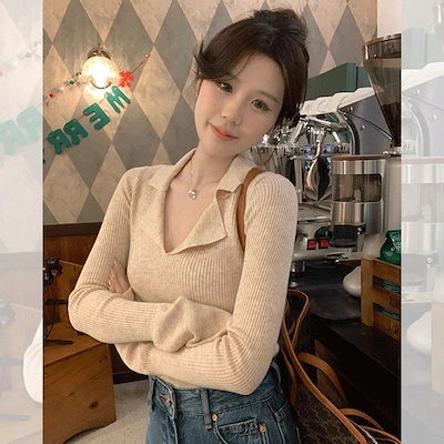 カシミヤタッチ 韓国ファッション 秋冬 Polo襟 アンダーウェア Vネック 高級感 ニッチデザイン ニットカーディガン 着痩せ 高級感 セーター 流行り 長袖 トップス