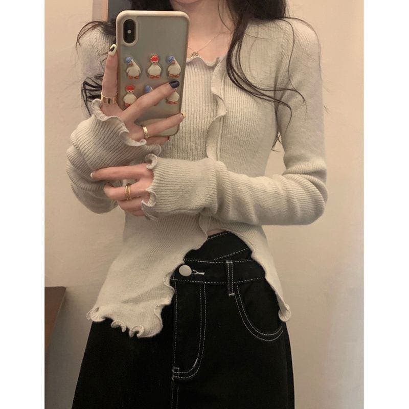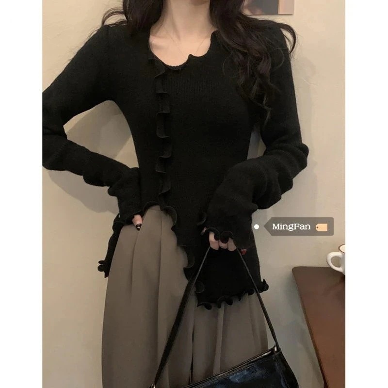 カシミヤタッチ 韓国ファッション 秋冬 長袖 アンダーウェア 個性 ニッチデザイン イレギュラー ニットカーディガン 木耳縁 ショート スリット セーター 長袖 トップス