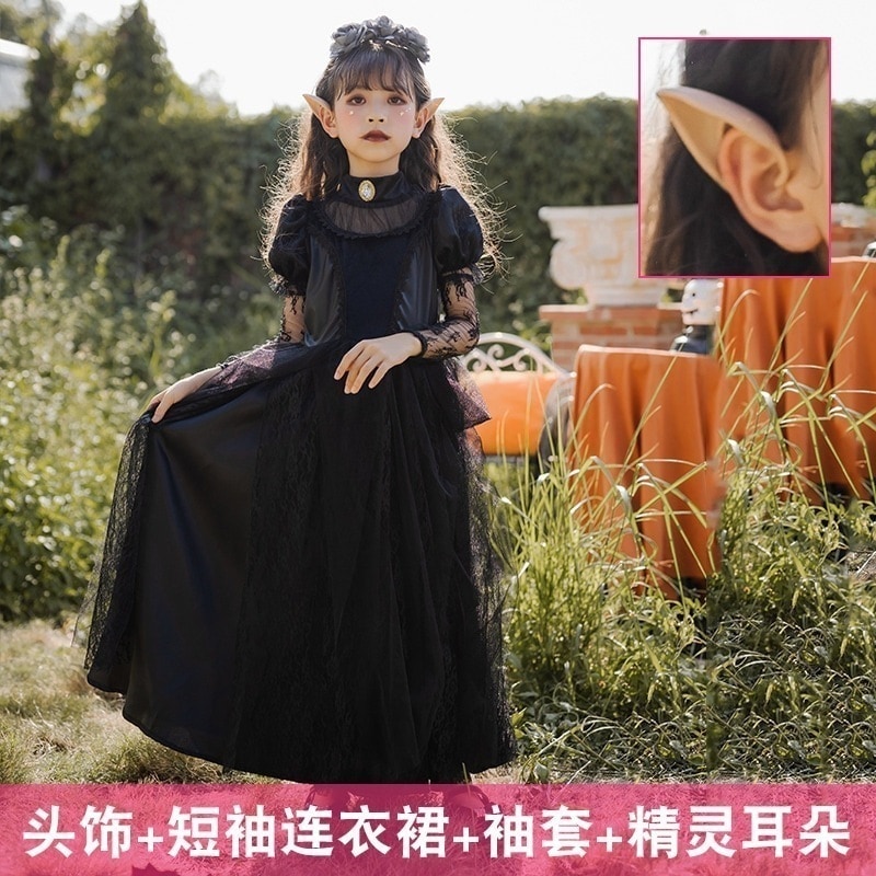 ハロウィン 【魔女エルフコスプレ】 黒ワンピース 3点セット コスプレ 魔女 キッズ 女の子
