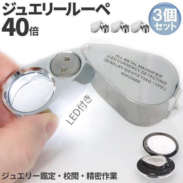 LED付きルーペ 高倍率 拡大鏡 3個セット ルーペ 倍率40倍 ケース付き 携帯携帯ルーペ LEDライト ブラックライト 軽量 持ち運び便利 宝石鑑