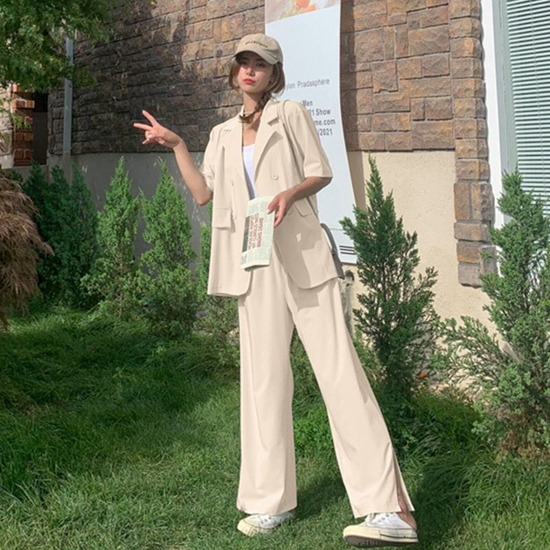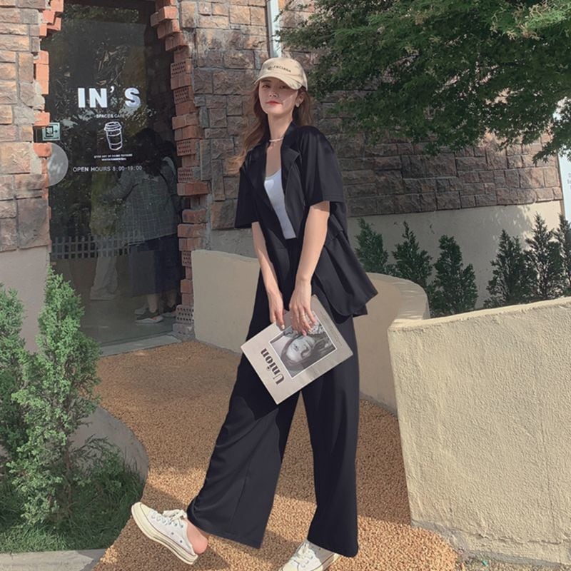涼しく楽ちんセットアップ 大判ワイドパンツスーツ夏の薄手ゆったり半袖+長ズボン2点セット レディー今日は30パーセント
