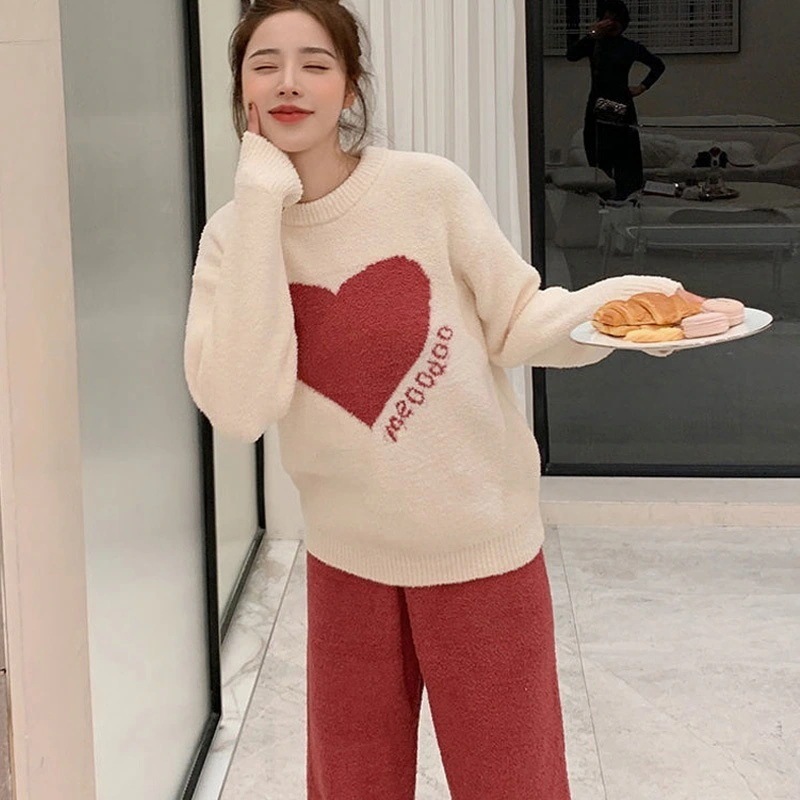 もこもこパジャマ レディース ルームウェア セットアップ ハート柄 可愛い 部屋着 秋冬 韓国新品 上下セット 部屋着期間限定30%
