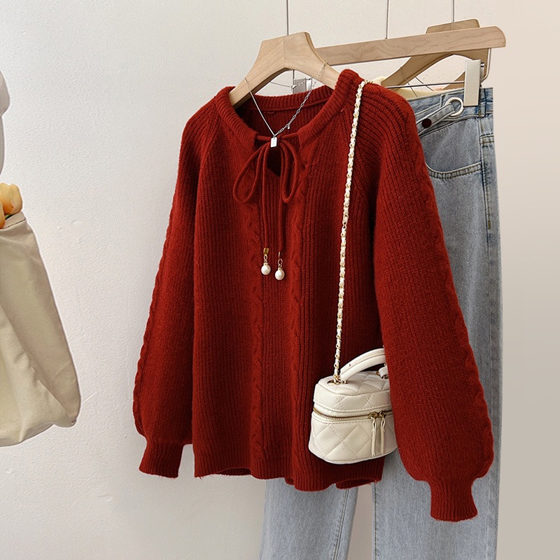 赤いセーターの女性2024新型秋冬高級感のある服新年の上着