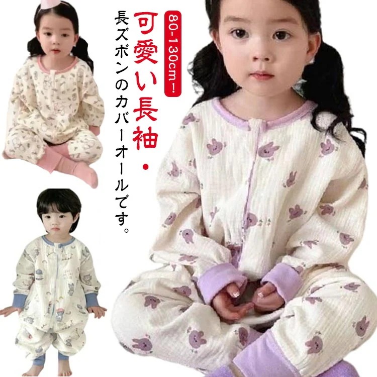 ロンパース カバーオール 綿 ベビーロンパース 寝袋 ガーゼ つなぎ パジャマ キッズ ベビー 赤ちゃん ベビースリーパー 総柄 長袖 前開き ファスナー 女の子 男の子 ボディスーツ 春