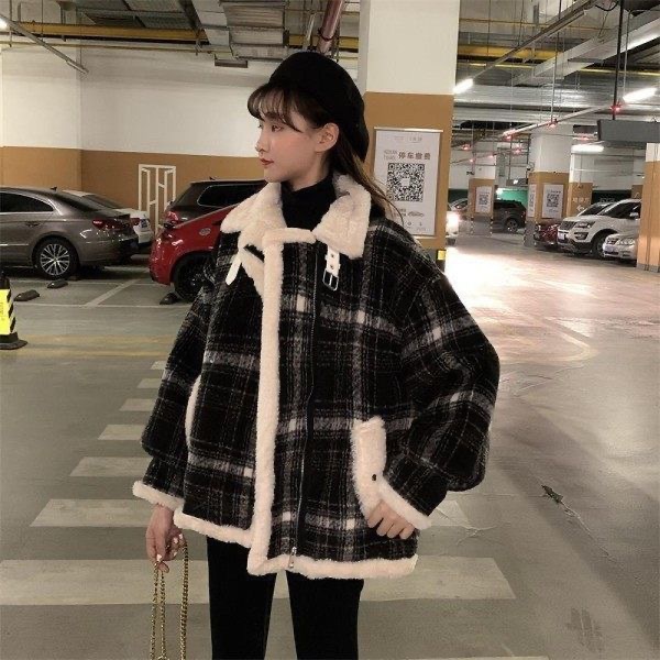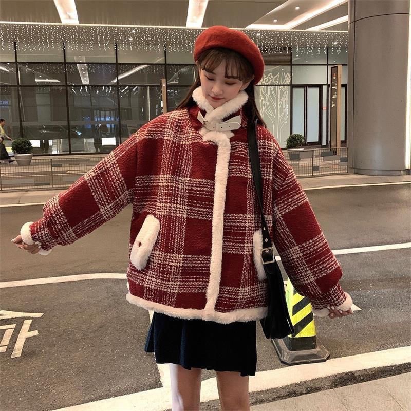 韓国版外国風厚手の小人数毛織物のつなぎ目格子厚手長袖碁盤格ゆったり上着コート女性秋冬