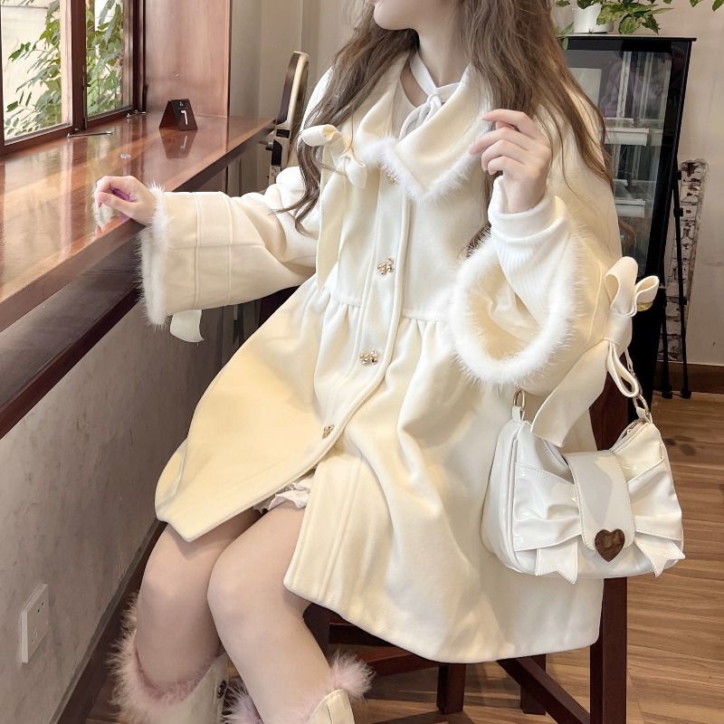 小柄なドールネックの白いコート秋冬の高級感プラス厚毛のラシャコート2024新型