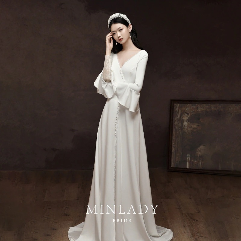 ウェディングドレスロングドレス結婚式ウエディングドレス海外挙式二次会花嫁前撮りエレガントサテン長袖ホワイトシンプルリゾートドレス後撮り今日は30パーセント