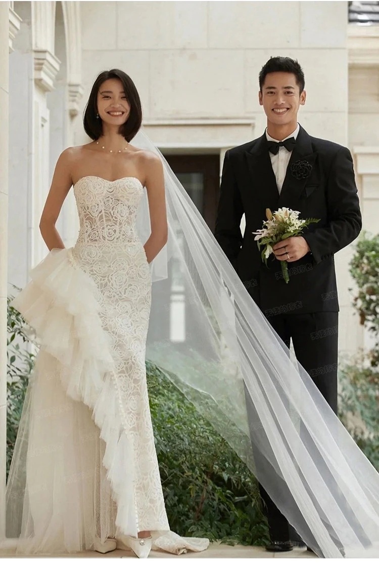 ウェディングドレス白二次会フレンチレースのドノースリーブ結婚式ドレス花嫁フォトウエディングビーチフォト前撮り後撮り披露宴ロングドレス今日は30パーセント